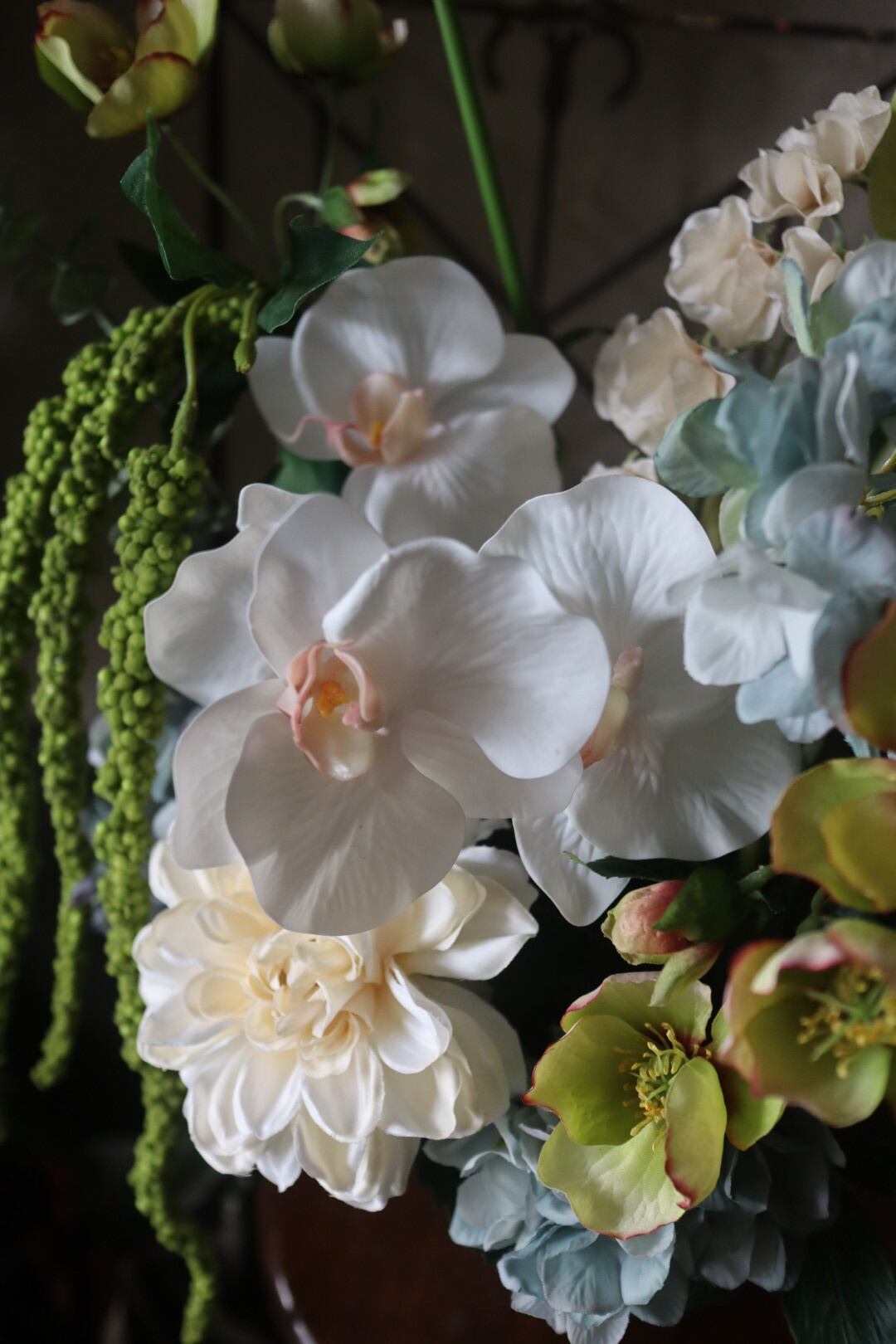 gläntaではアーティフィシャルの中でも、生花と見間違ってしまいそうな、よりリアルな花材を選びアレンジメントを制作しております。