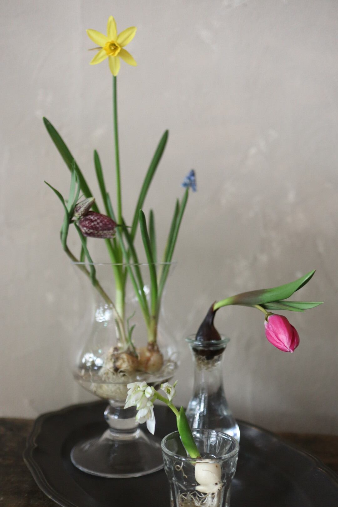 こちらの球根植物は、グラスやお皿などの器に根っこが水に浸かる位にお水をはって飾ってください。1種類ずつでも数種類をまとめてでもOKです。