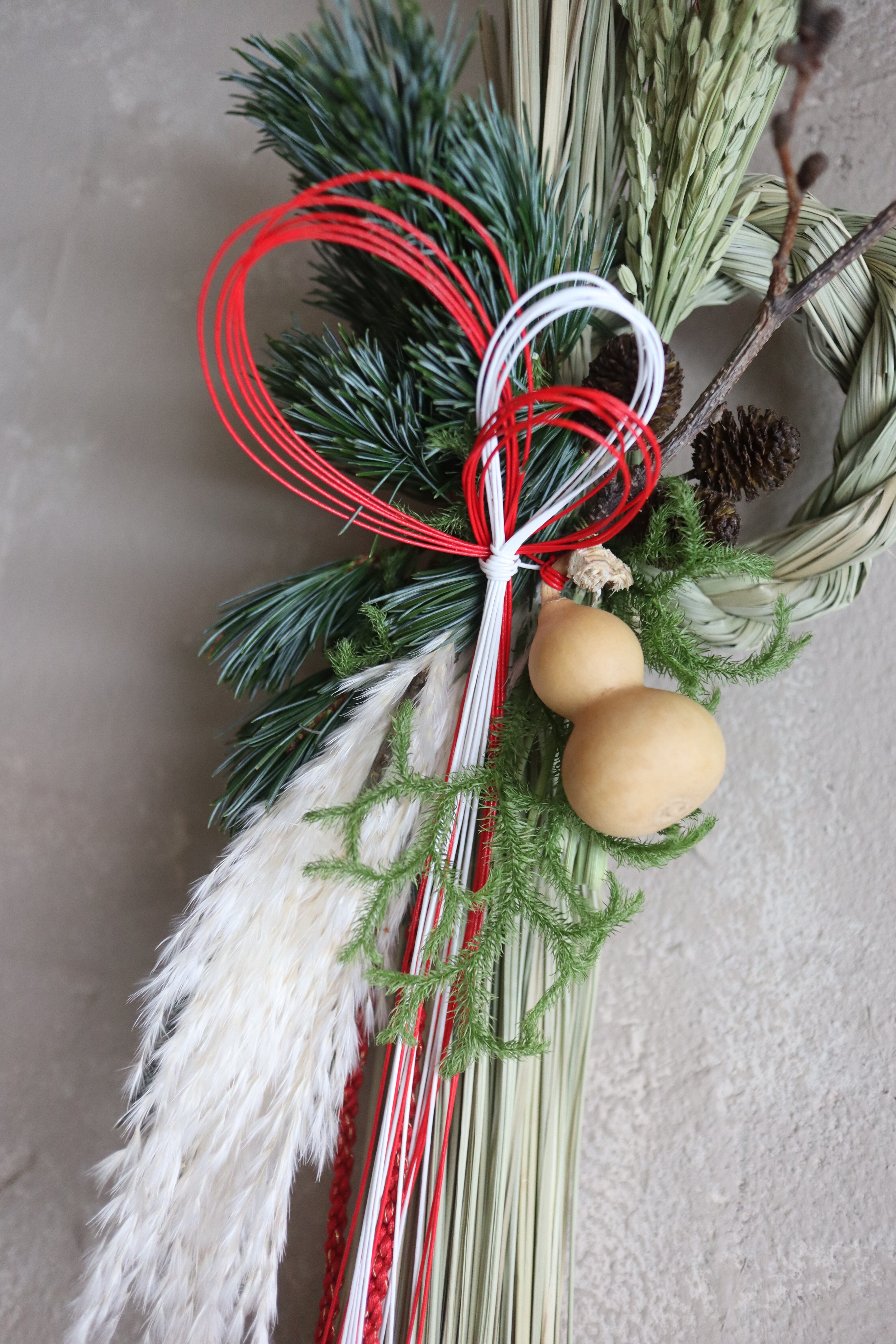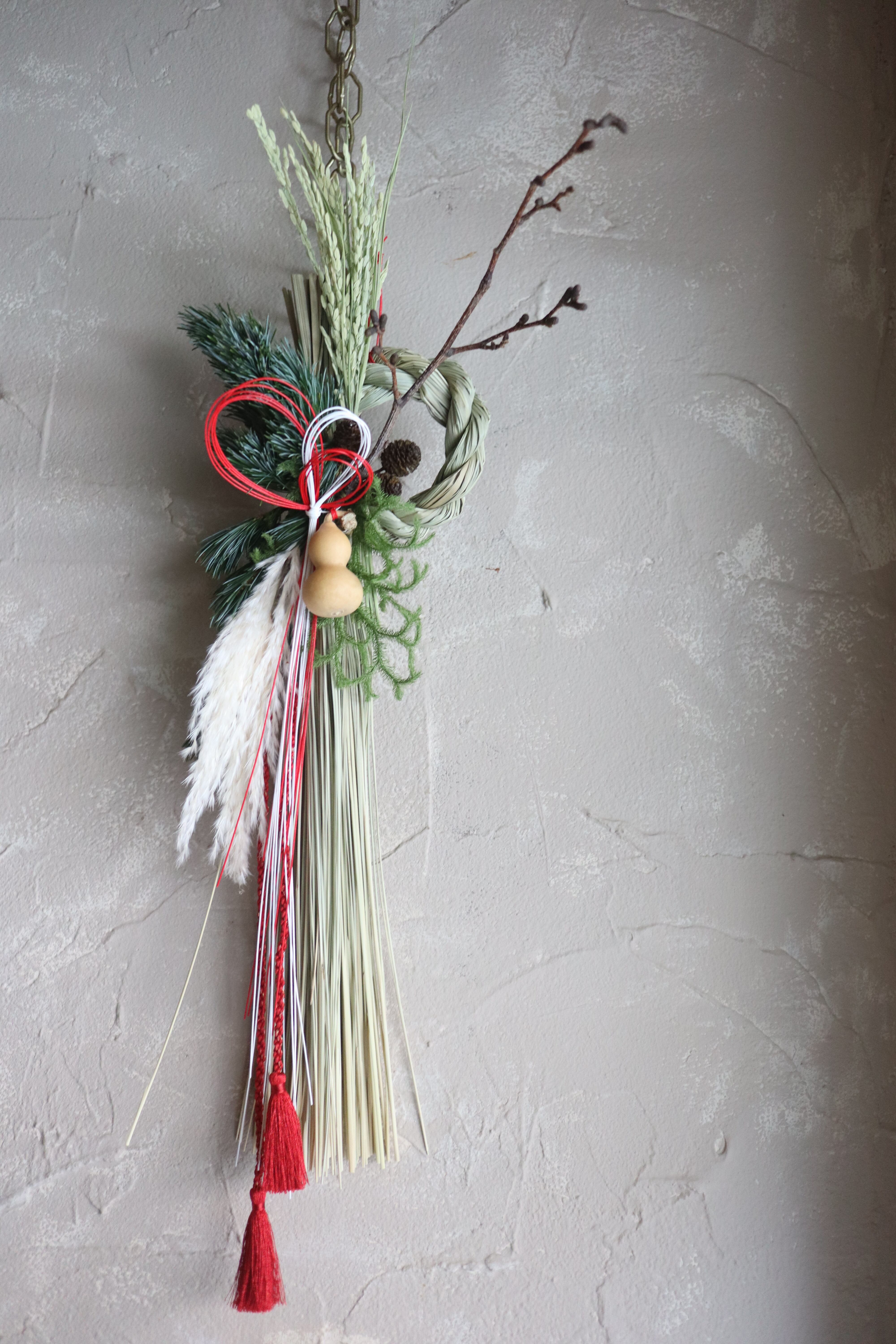 ▶しめ縄に五葉松、稲穂、ヒカゲカズラ、豆ひょうたん、ハンの木、パンパス等をあしらったお正月飾りです。
