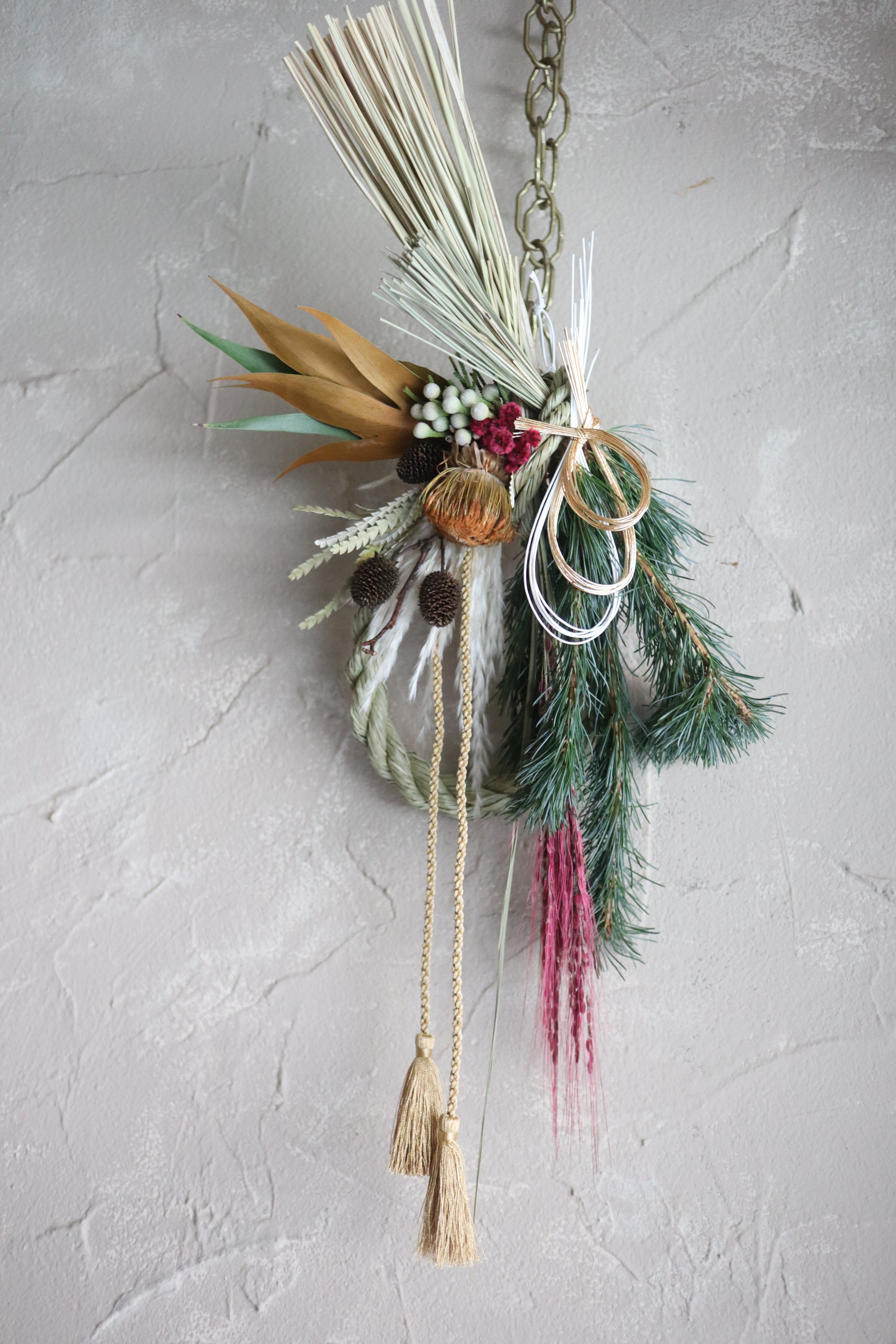 ▶しめ縄に五葉松、稲穂、ハンの木、パンパス、グレビレア、ドライアンドラ・フォルモーサ等をあしらったお正月飾りです。