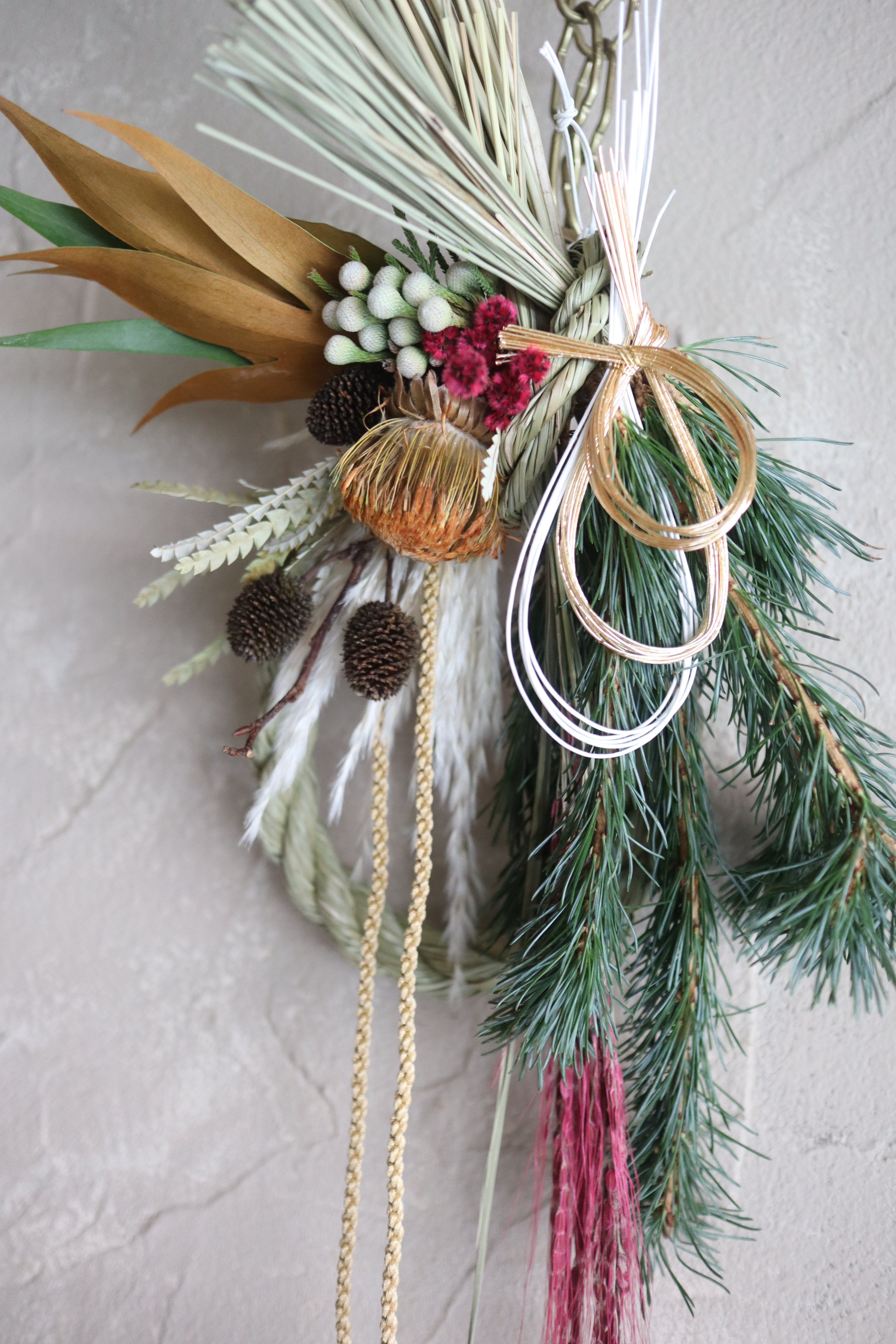 ▶しめ縄に五葉松、稲穂、ハンの木、パンパス、グレビレア、ドライアンドラ・フォルモーサ等をあしらったお正月飾りです。